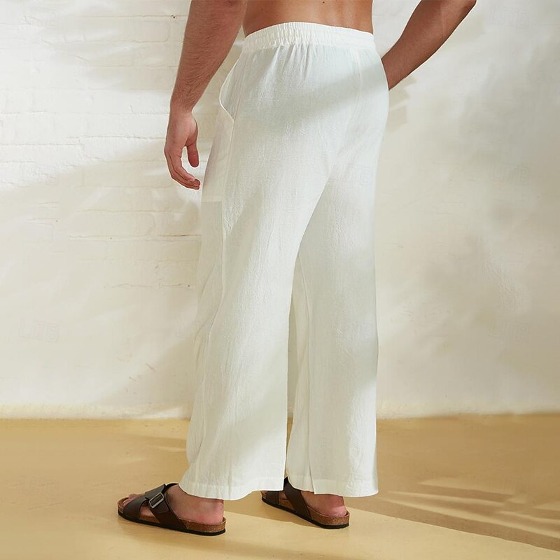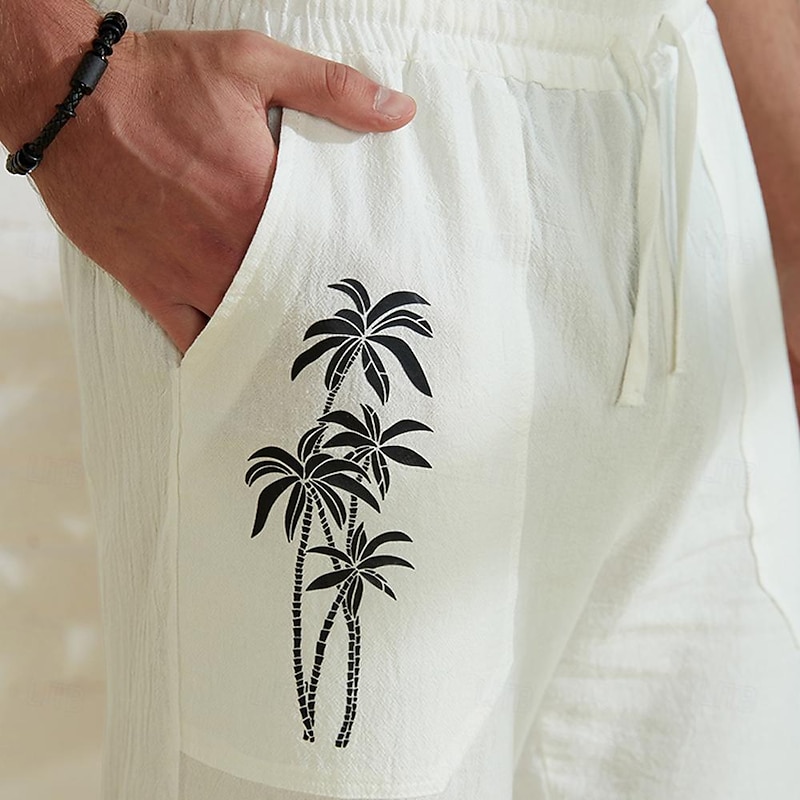 Highlights [Fabric]: These men's pants are crafted from a blend of 80% cotton and 20% linen, offering a lightweight and breathable fabric that's ideal for warm weather. The material ensures maximum comfort and a micro-elastic fit for easy movement during any activity. [Fit]: Designed with a relaxed, wide-leg cut, these trousers provide a loose fit that allows for ease and comfort without sacrificing style. The casual tailoring is perfect for outdoor activities and laid-back beach or resort settings. [Design Highlights]: Featuring an elastic waistband with a drawstring, these pants offer an adjustable fit that enhances comfort. The design is complemented by side pockets, one of which is adorned with a trendy palm tree print, adding a tropical flair to your outfit. [Occasions]: Perfect for a variety of casual settings, these pants are suitable for outdoor adventures, streetwear, or holiday trips, bringing a touch of Hawaiian style to your wardrobe. Whether you're on the beach or exploring city streets, these trousers provide a stylish and comfortable option. [Size Range]: Available in sizes S, M, L, XL, XXL, and 3XL, these pants are designed to fit a wide range of body types, ensuring everyone can enjoy their comfort and style.