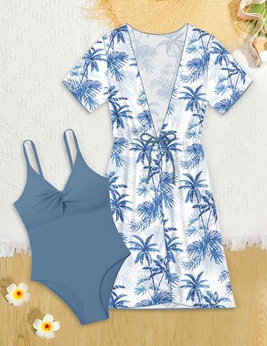 KANGKANG Girls Swimsuit, Solid Color Girl One Piece Swimsuits with Tropical Print Drawstring Cover Up Bathing Suits Set 9-16Y