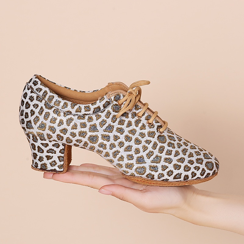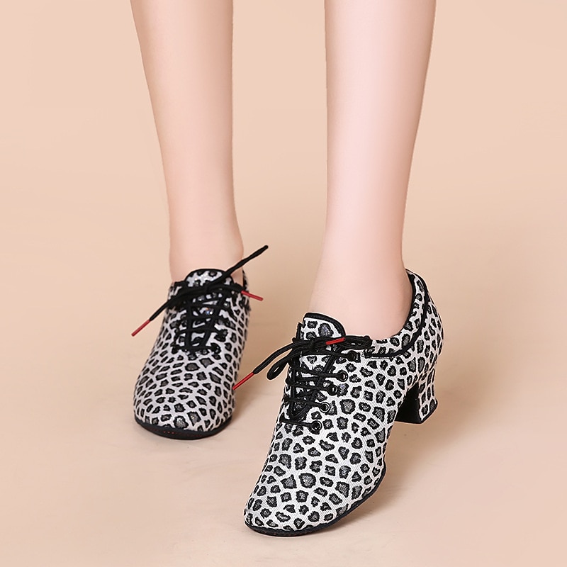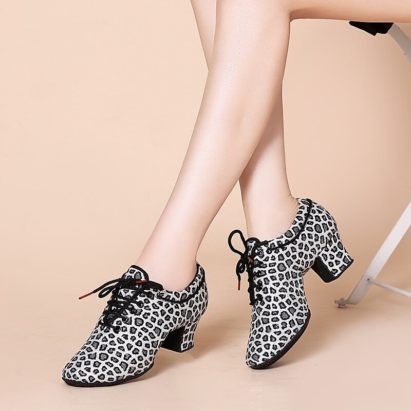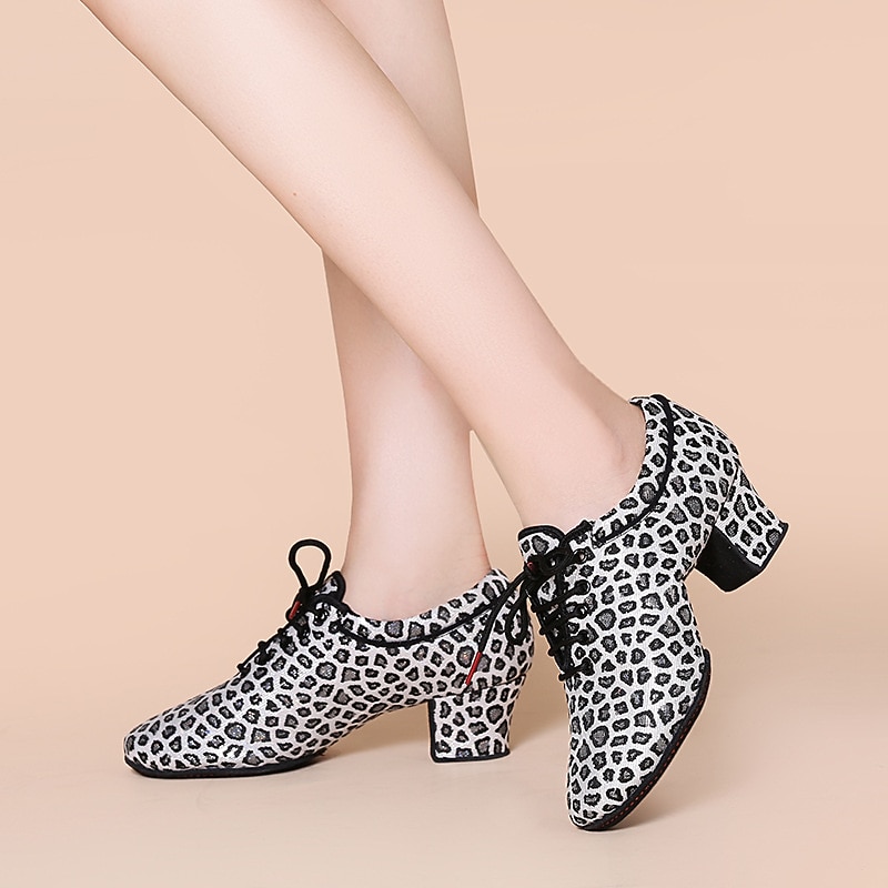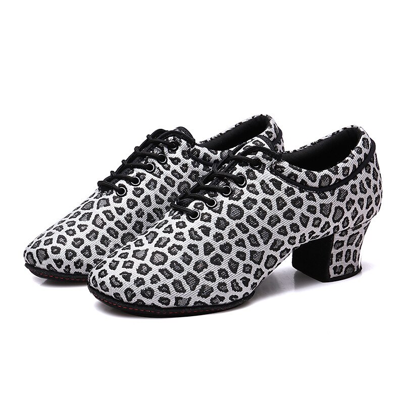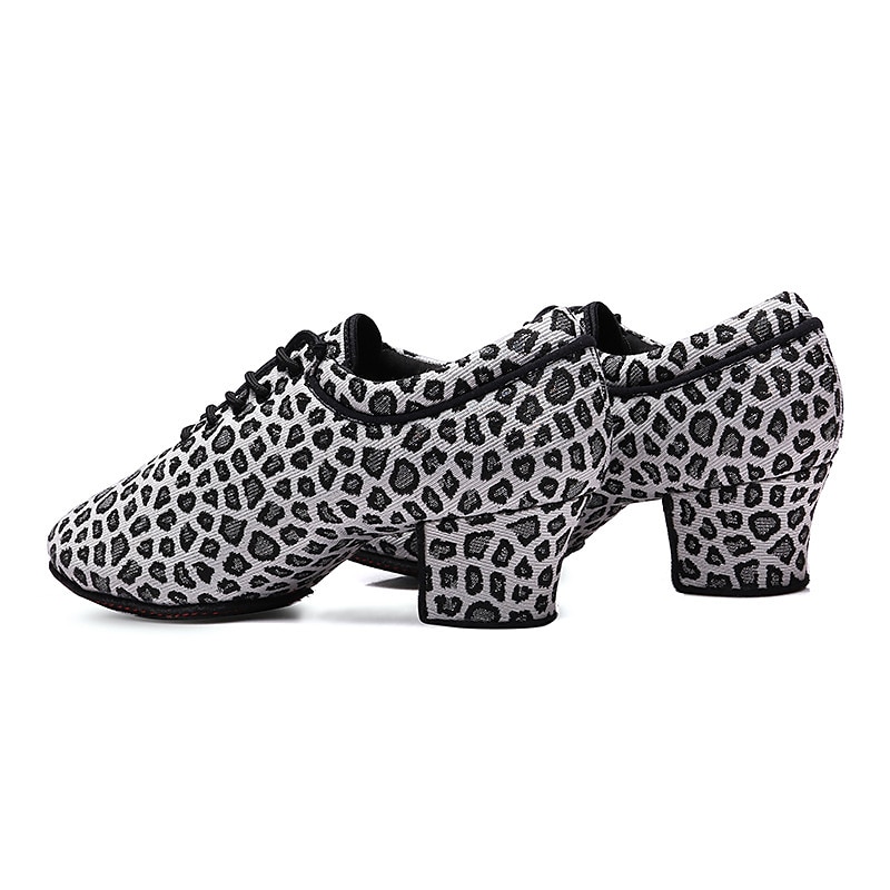 Highlights [Fabric and Fit] : Crafted from high-quality tulle and fabric lining, these Women’s Latin Dance Shoes offer a breathable and comfortable fit ideal for extensive wear. The lace-up closure ensures a secure and customizable fit, catering to both casual practice sessions and intense performances. [Design Highlights] : Emphasizing a round toe and medium-height Cuban heel, these shoes combine elegance with practical design. The animal print design adds a trendy and eye-catching element, while the block heel offers stability. [Occasions] : Perfect for both practice and performance, these shoes suit a variety of dance environments, from training sessions to formal events. Their versatile style makes them an ideal choice for dancers seeking elegance and comfort alike. [Versatile Use] : Suitable for adult women, these shoes are categorized under Latin Dance and Practice Training shoes, making them an essential part of a dancer’s attire for both casual and formal occasions. [Size Notice] : Available in a comprehensive range of sizes from US5 (EU35) to US9 (EU40). For those with wider feet, it is recommended to choose a size up for optimal comfort.