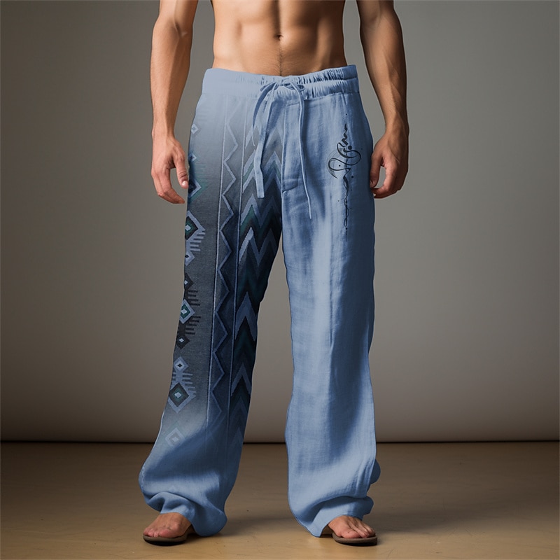 : These men's pants boast an ethnic-inspired pattern with geometric shapes, lending a distinct cultural flair. The baggy cut enhances the laid-back, vintage style, while the side pattern adds an eye-catching detail.