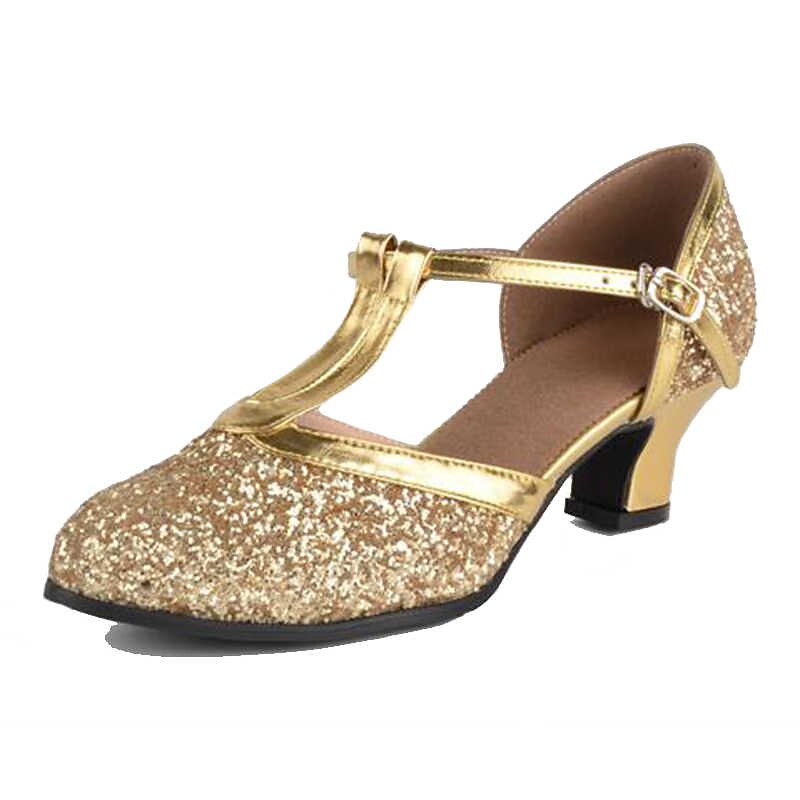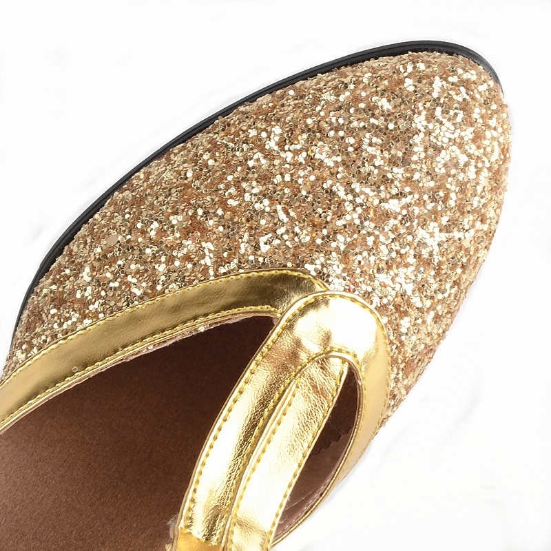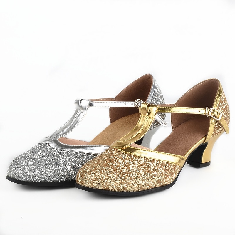 Highlights [Fabric] These women's ballroom dance shoes are elegantly crafted with a shimmering paillette upper that adds a touch of sparkle to every dance move. The lining is made from smooth, comfortable fabric to ensure a snug fit throughout your dance sessions. [Fit] Designed with a contemporary silhouette, these dance shoes feature a mid-height 4cm thick heel. This perfect balance ensures support and poise, allowing for confident dance steps while maintaining grace. [Design Highlights] The classic T-strap design is complemented by a secure toggle clasp, providing ease and stability during performances. Elegant splicing details enhance the visual appeal, making these dance shoes a centerpiece of your dance attire. [Occasions] Ideal for a variety of settings including ballroom, modern dance, outdoor performances, and waltz events. These shoes seamlessly blend style and functionality, making them perfect for both stage and social occasions. [Size Range] Available in a wide range of sizes to fit different preferences: US5 to US9. The array of choices ensures that dancers can find their ideal fit for ultimate comfort and performance.