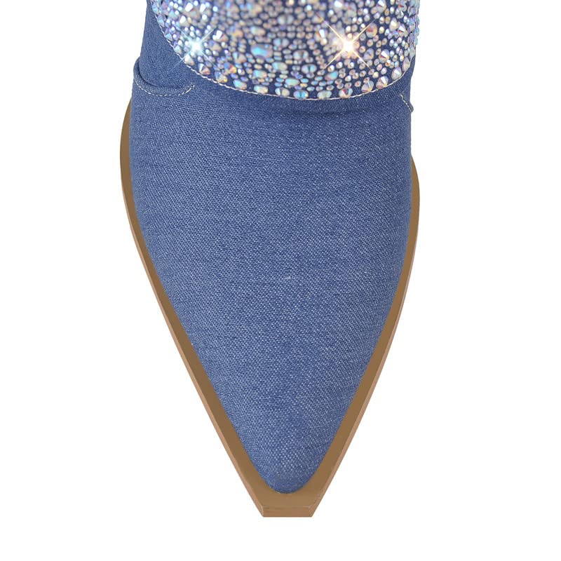 • Western denim knee high boots decorated with comfy low chunky heels, fashionable sparkly rystal-embellished material and traditional pointed toe design