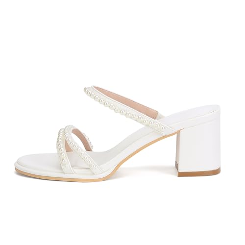 TarfiC 2.36 inches Women's Chunky High Heels Block Heel Sandals Peep Toe Ivory Pearls Bridal Wedding Shoes Women Sandals 4
