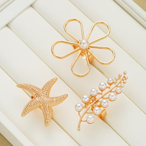 HOT ! Women's Ocean-Themed Ring Set, 3-Piece Adjustable Open Rings with Starfish, Pearl Branch & Wire Flower Design, Summer Statement Jewelry