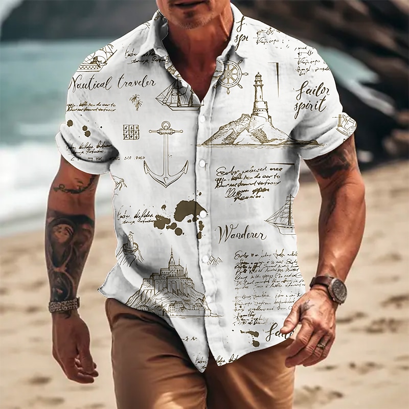 More information about Men's Anchor Vintage Compass Shirt Button Up Shirt Short Sleeve Vintage Fashion Designer Outdoor Casual Summer Spring Turndown Print Black White Yellow Blue Gray