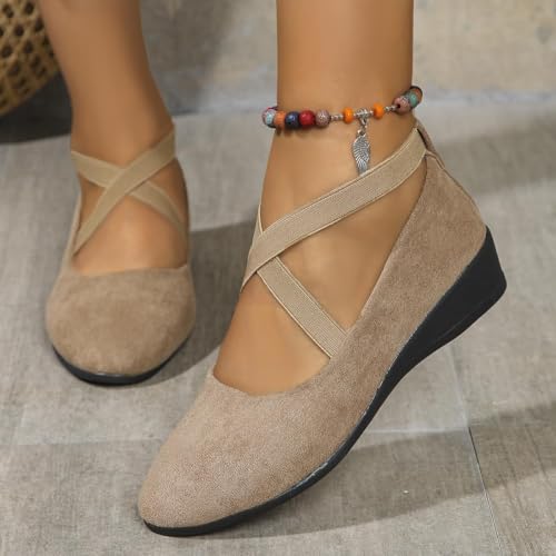 HOT ! Women's Crisscross Strap Wedge Shoes,Womens Round Toe Ballet Wedge Dress Shoe Elegant Suede Comfy Slip-On Shoes