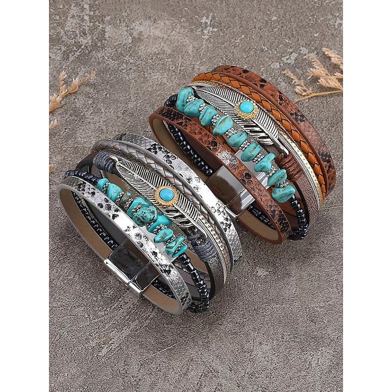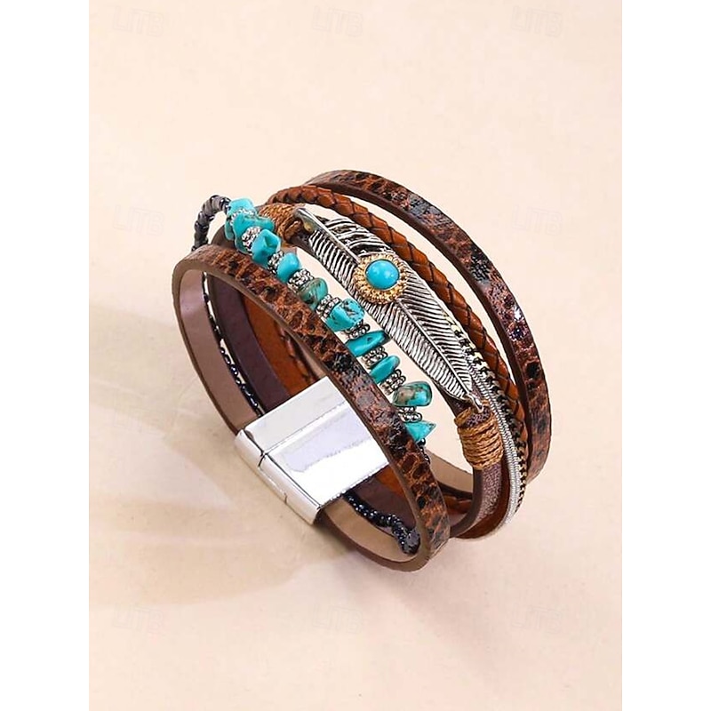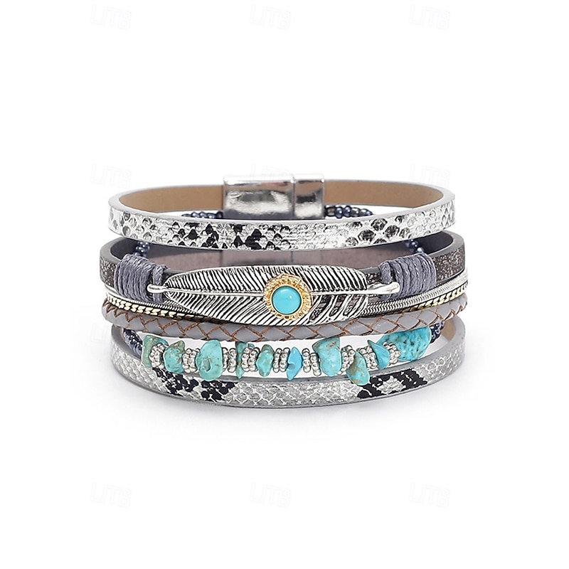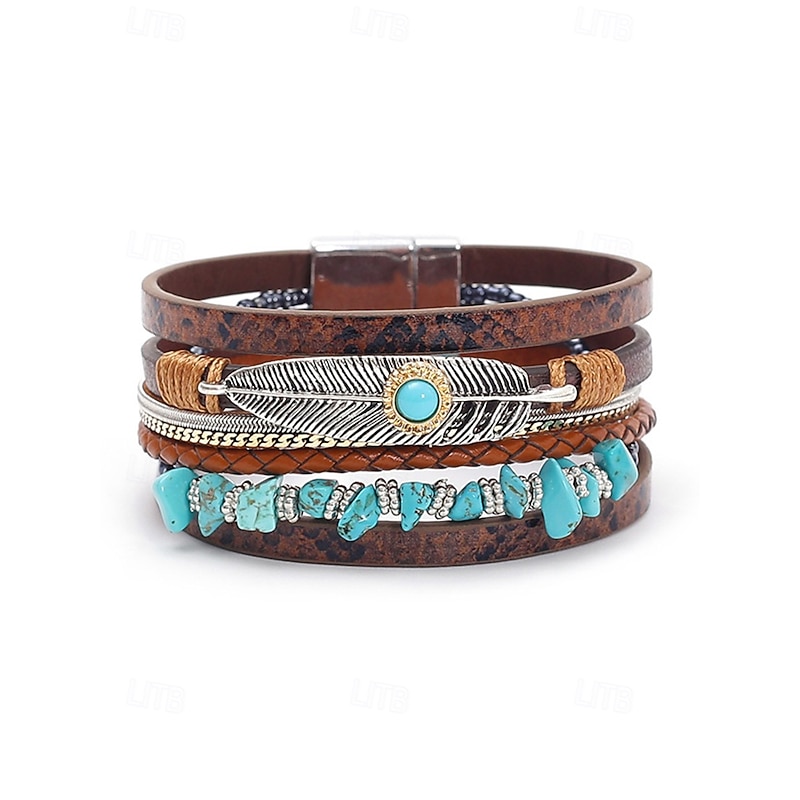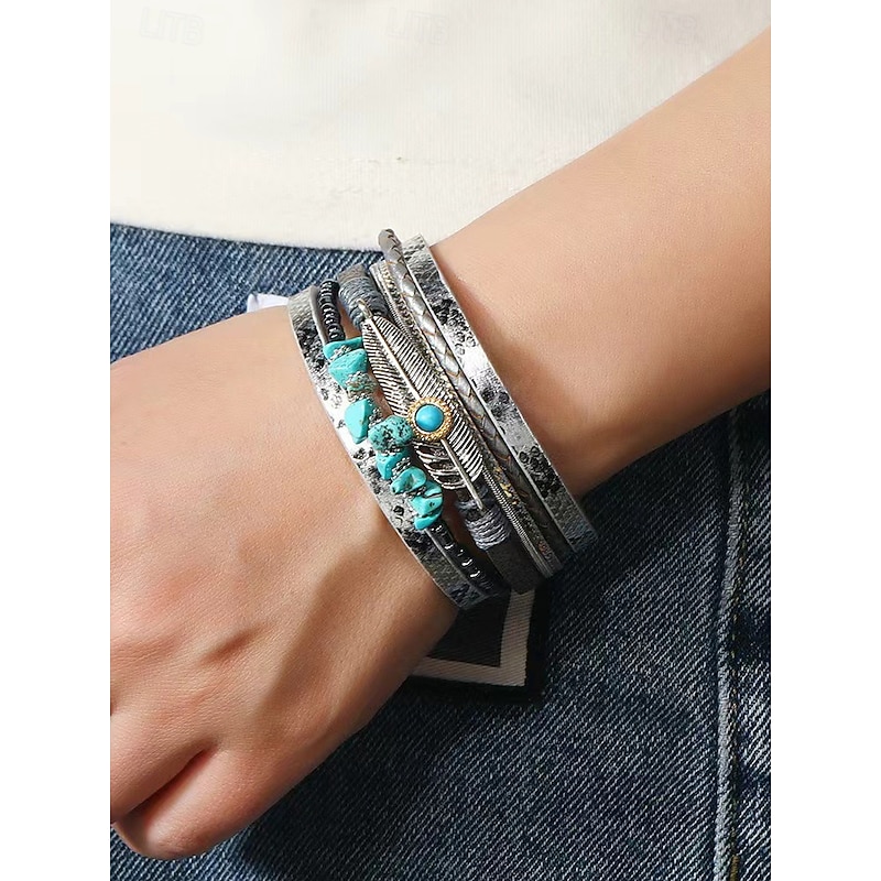 $11.99 - Boho Leather and Turquoise Magnetic Bracelet Wristband - Adjustable multi-layered design with feathers and gemstones, perfect for casual, summer and festival styles 2025. Shop for cheap Women's Bracelet online? Buy at lightinthebox.com on sale today!