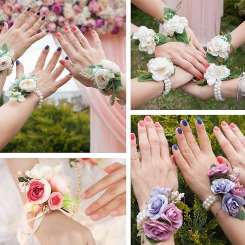 • Package Contents: The set contains 6 wrist flower bracelets and 6 wrist flower bracelets with wreaths, two styles for you to choose from, corsage wristlet band is suitable for brides, bridesmaids, flower girls and wedding guests. Wrist corsage bracelets is made of double-layer imitation pearl material, with a warm and soft luster, exuding an elegant temperament, especially suitable for styling on the wedding day.
