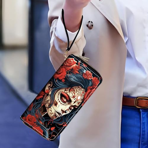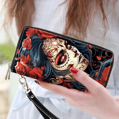 More information about Women's Large Capacity Wallet PU Leather Double Zipper Clutch Purse Multifunctional Wallet with Removable Wristlet Strap for Smart Phone/Coin/Card/Cash, Sugar Skull Girl Roses