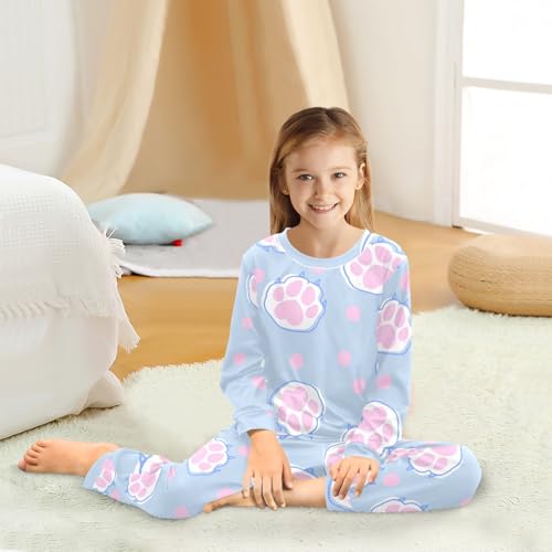 Pajama Set Long Sleeve for Boys & Girls,Cute Cat Paw Pink Kid's Soft Sleepwear Crewneck Loungewear 2 Piece PJ Underwear Set 5T 6