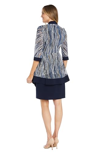 • Stylish Two-Piece Set: A knee-length solid navy sheath dress paired with a coordinating leaf-print jacket for a refined look.