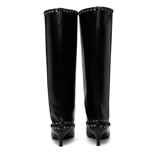 Sole material: RubberShaft height: 13.77Shaft circumference: 14.5 InchesOuter material: Faux Leather❤👢HEEL HEIGHT👢: 6.5 cm/2.55 inches stiletto heeled long boots, Shaft Height: 13.77 inches, Shaft Circumference: 14.5 inches.please refer size:7 to the cylinder circumference and height data to ensure that the boots you receive fit properly.❤👢 SPECIAL DESIGN👢: Silver metal grommet and lace-up detail design, pull on closure, making the knee-high boots easy to adjust the tightness, adding a sense of layering.❤👢timeless AND FASHION👢: With a pointy toe and kitten heels wide calf tall boots, well modify the calf line, elegant and sexy.❤👢PERFECT MATCH👢: These long boots match with clothes, you can choose different styles such as skirts, jeans, etc. to show different fashion styles.❤👢WEAR OCCASION👢: The wide calf boots for are suitable office, dating, party, shopping, travel or other special occasions. Perfect for everyday use. excellent materials and excellent craftsmanship ensure long-lasting durability.