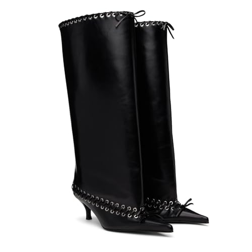 Goolita Metal Eyelets Pointed Toe Wide Calf Knee High Boots For Women Kitten Heel Lace Up Bow Pull On Tall Boots