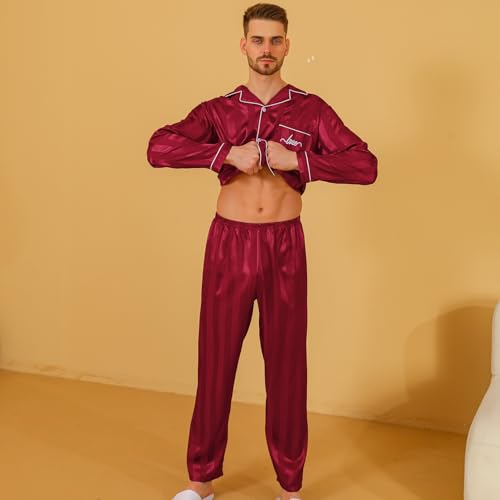 ShuiGod-Mens Silky Satin Pajamas Set Long Sleeve Top and Long pants Nightwear Button-Down Pj Sets Sleepwear