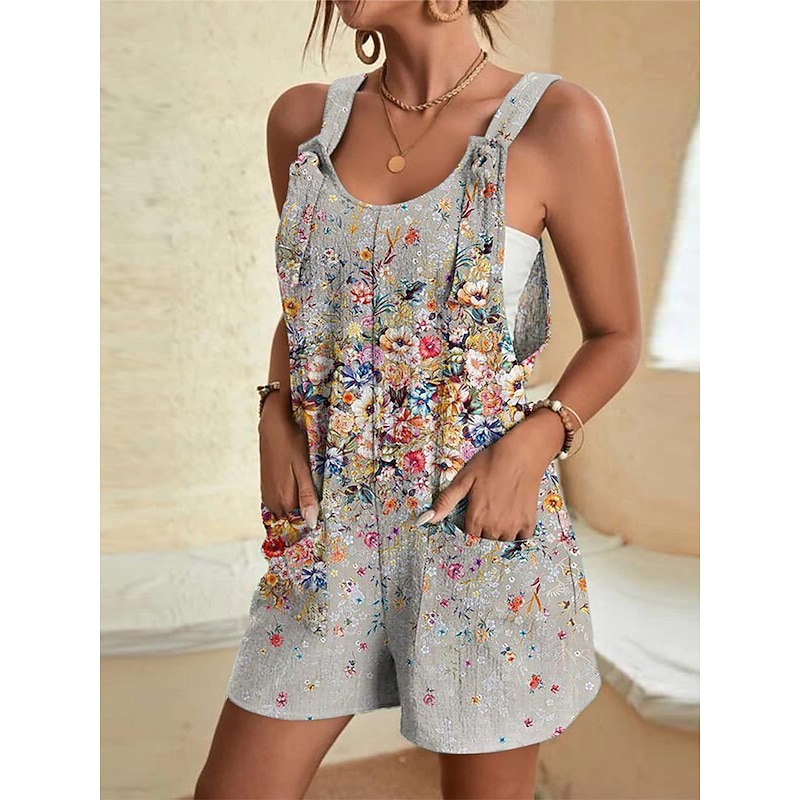 Womens Jumpsuits Casual Summer Overall Patch Pocket Print Floral Crew Neck Streetwear Daily Vacation Regular Fit Sleeveless Black White Yellow S M L 25