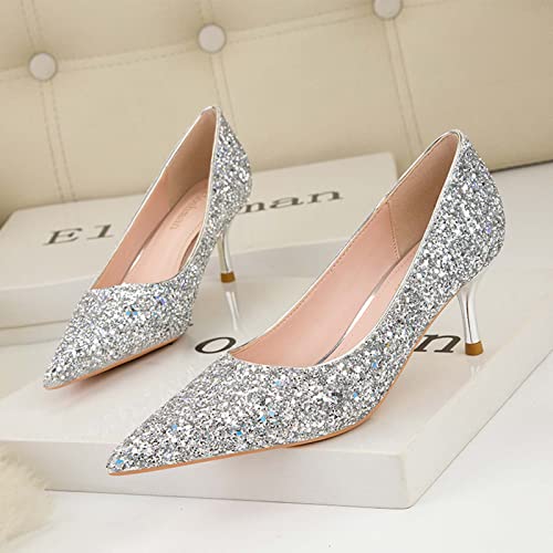 JOEupin Women's Fashion Glitter Sequins Pointed Toe Low Heel Pumps Wedding Dress Office Shoes 6