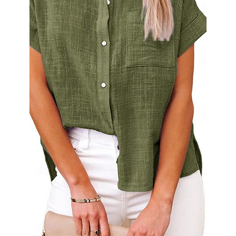 More information about Women's Shirt Cotton Linen Shirts Button Up Blouse Solid Color Basic Casual Short Sleeve Shirt Collar Regular Tops Daily Buttons Pocket Wine Army Green Summer
