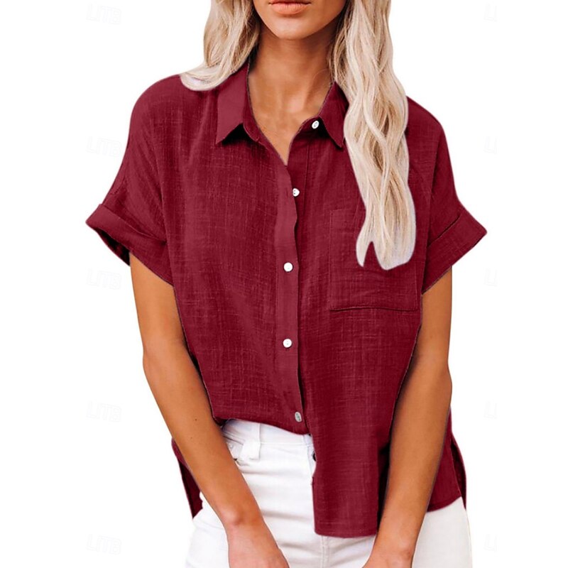 HOT ! Women's Shirt Cotton Linen Shirts Button Up Blouse Solid Color Basic Casual Short Sleeve Shirt Collar Regular Tops Daily Buttons Pocket Wine Army Green Summer