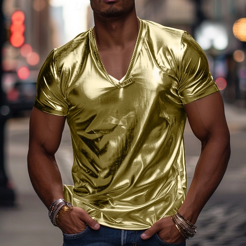 Highlights [Fabric & Fit] : Crafted from a blend of polyester and faux leather, this men's T-shirt offers a glossy, leather-like finish for a distinctive and modern look. The fabric is designed to be form-fitting, providing a slim silhouette that highlights the physique. The material is not only stylish but also easy to maintain with washable, wet, and dry cleaning options available. [Design Highlights] : The T-shirt features a classic V-neckline that adds a touch of sophistication while maintaining a casual vibe. The short sleeves are tailored to fit snugly, emphasizing an athletic build. Its sleek black finish makes it a standout piece for anyone looking to make a bold fashion statement. [Occasions] : Ideal for a variety of events including wedding parties and cocktail attire occasions. This T-shirt is perfect for those who want to showcase a modern and edgy style, suitable for both night outs and contemporary casual settings. [Size Range] : Available in a range of sizes from S to 3XL, ensuring a comfortable fit for a variety of body types. The versatile color options—Black, Silver, and Gold—allow for easy pairing with different bottoms, from jeans to formal trousers.