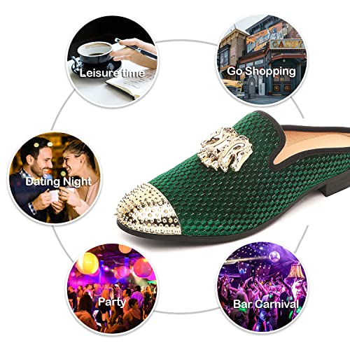 • ★ Comfortable & Exciting to Wear: Our men's backless loafers made from the highest quality Velvet, supple and durable, 2 colors (Leopard, green). Make a stylish style statement wearing the open-back loafers with fashion buckles and spikes design, which provides a perfect opportunity to show your personality.