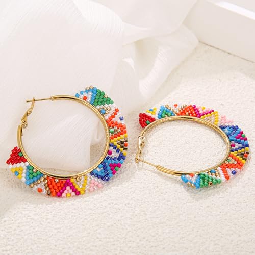 HOT ! Boho Beaded Hoop Earrings, Handmade Colorful Beads Gold Hoop Earrings for Women Big Circle Bead Huggie Earrings