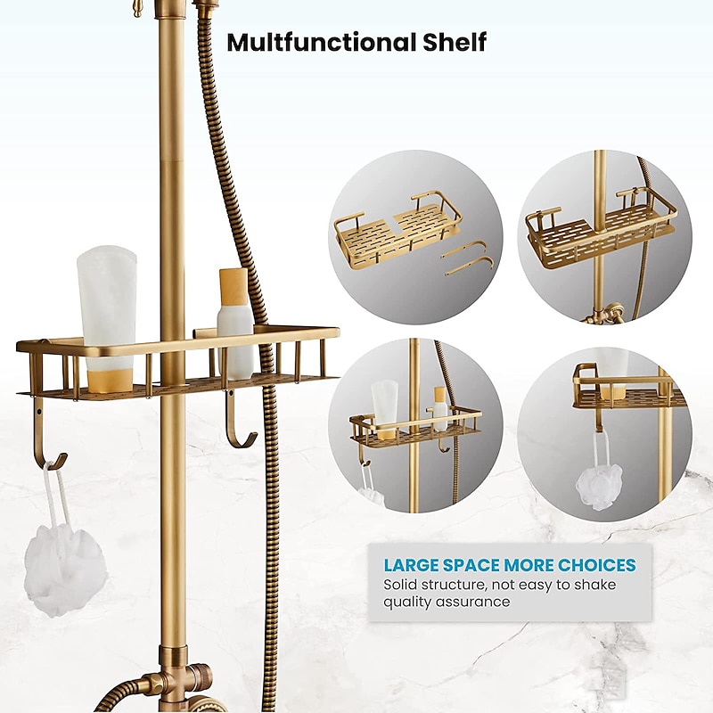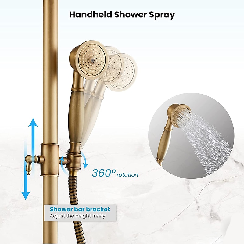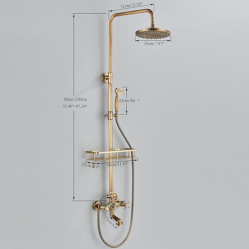 Highlights ✨【3-Function Antique Brass Shower Fixture】8" rainfall shower head covers your whole body, handheld shower with shower hose, and waterfall tub swivel spout quickly fills your tub in a few minutes. Double cross handles to control hot and cold water respectively. All shower functions can only be used individually to ensure sufficient water pressure. ✨【Brass Material】This exposed shower faucet set is made of premium brass, antique brass finish resists corrosion in humid environments, ensures durability and dependability, and better longevity. ✨【Outdoor Shower Fixtures Dimension】Total height: 80cm-120cm(31.49"- 47.24"). The height of the handheld shower bracket is also adjustable. Come with a Shower Shelf that can hold shower supplies. ✨【Easy to Use and Easy to Install】Antique brass shower faucet set's diverter can easily switch between rainfall shower head and handheld shower, the handle in the middle controls tub spout. 2 holes installation.