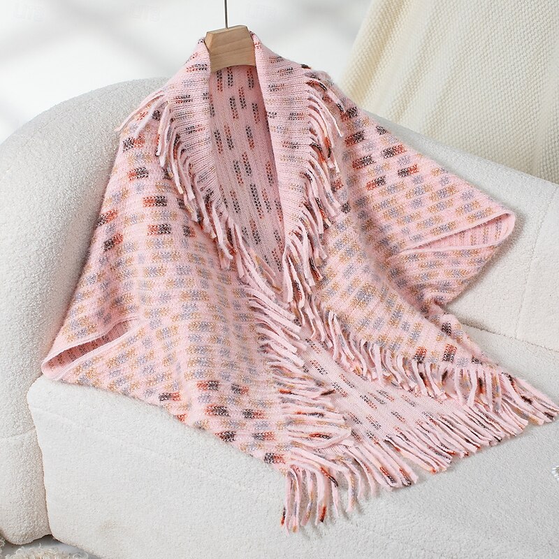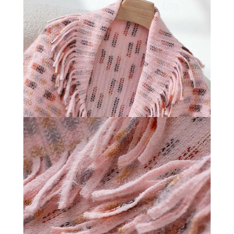 Highlights [Fabric] : Crafted from a cozy, soft knit, this women's shawl combines high-quality polyester with a trendy animal print, offering micro-elasticity for a comfortable fit. Perfect for complementing your outerwear during the colder fall and winter seasons. [Silhouette] : This shrug features a loose fit design, effortlessly enhancing your casual, stylish look. The open-front construction allows for a relaxed drape over the shoulders, combining ease of wear with chic elegance. [Design Highlights] : The shawl showcases an exquisite fringe finish that lends a bohemian flair, while its sleeveless style ensures versatility and layering options. The detailed, knitted pattern adds a touch of artisanal craftsmanship. [Occasions] : Ideal for daily wear and outdoor activities, this shawl seamlessly transitions between casual gatherings and more sophisticated outings, ensuring you stay warm and stylish in various settings. [Size] : Available in a convenient one-size-fits-all, this shawl is designed to accommodate different body types, making it a versatile addition to your wardrobe.