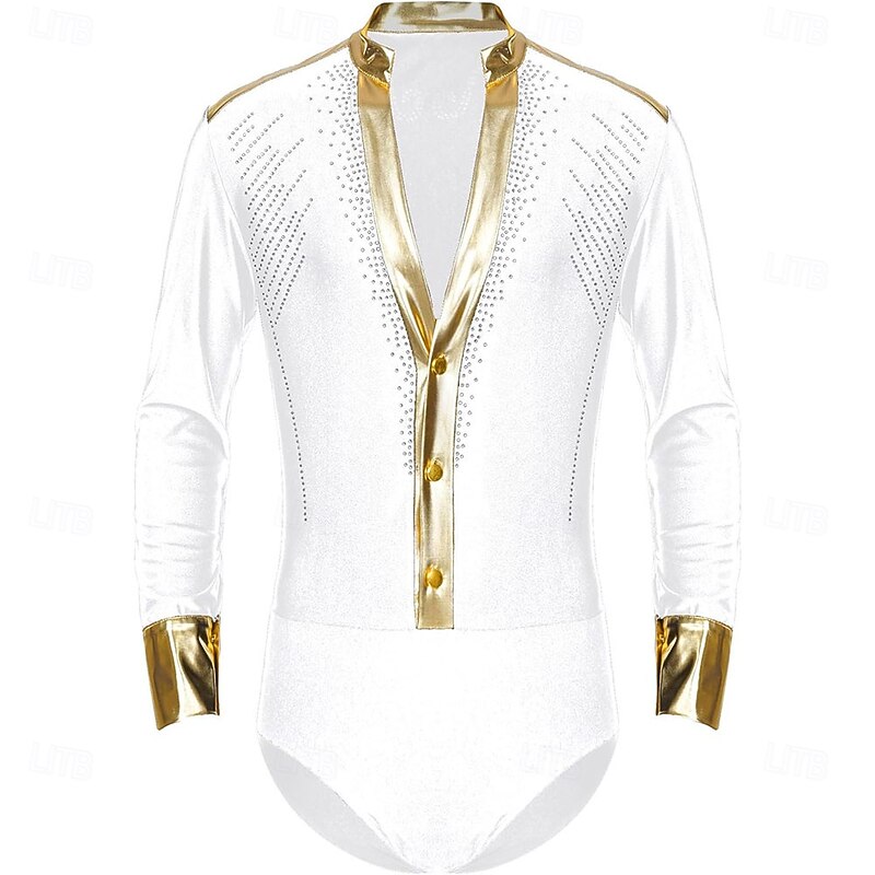 Men Shiny Rhinestones V Neck Long Sleeves Latin Dance Shirt Figure Skating Dance Leotard Bodysuit Costume 1