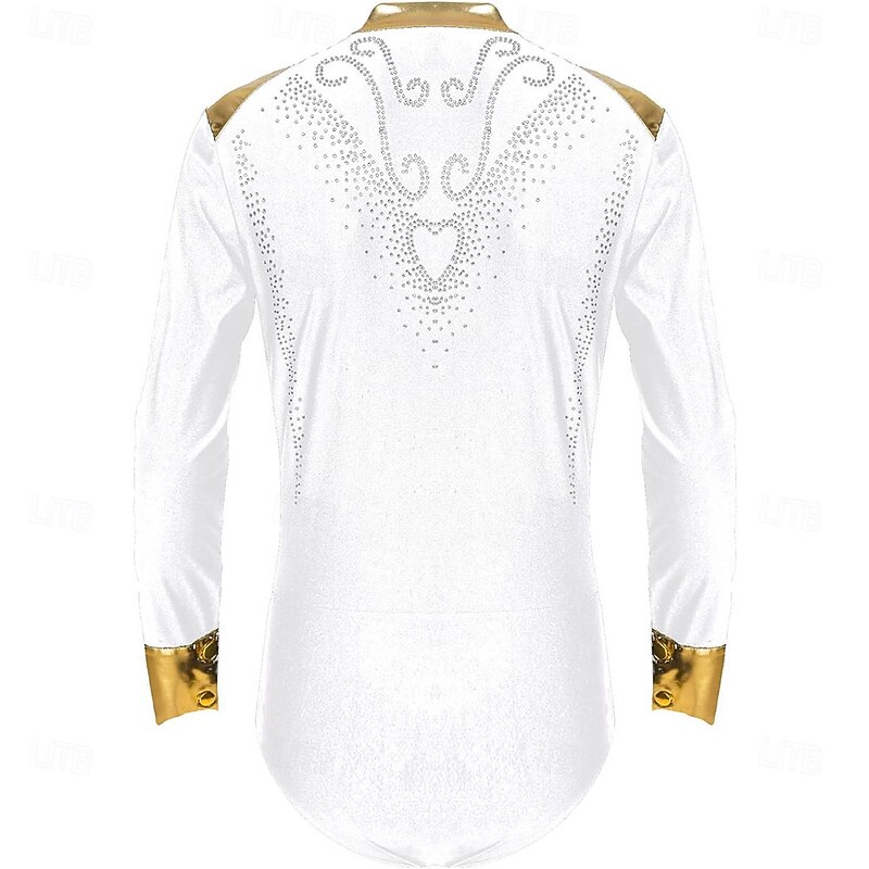 Men Shiny Rhinestones V Neck Long Sleeves Latin Dance Shirt Figure Skating Dance Leotard Bodysuit Costume 6