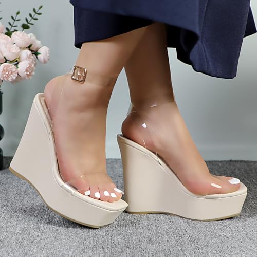 Womens High-Heel Platform Wedge Heel Sandals Clear Ankle Strap Square Toe Heels 4