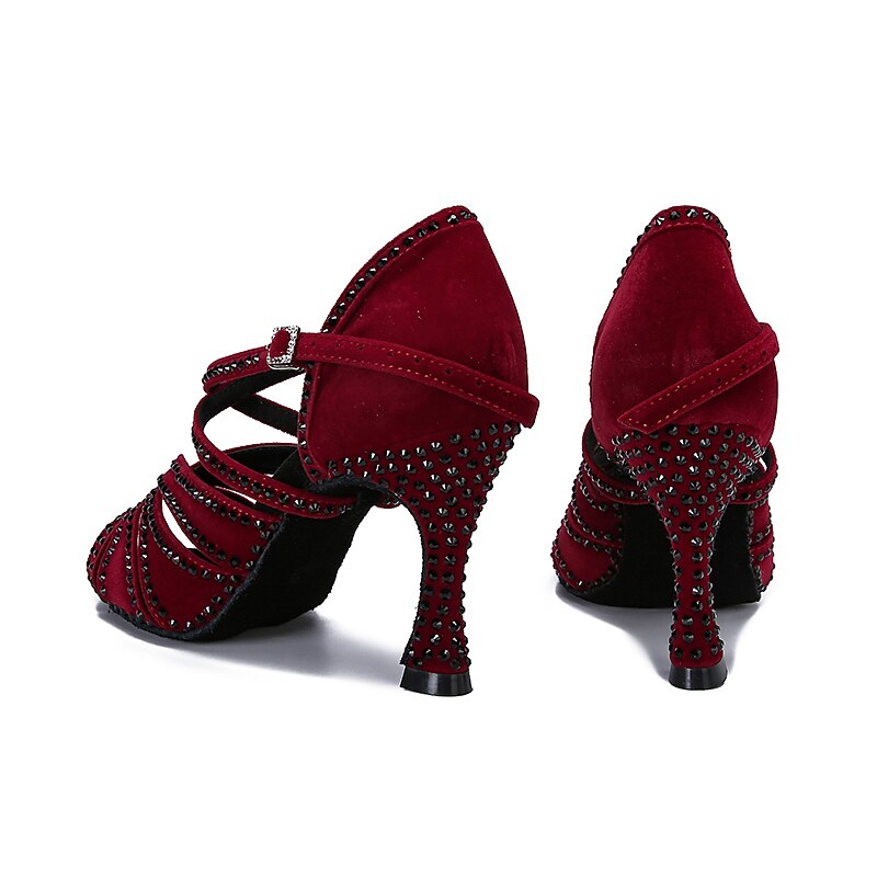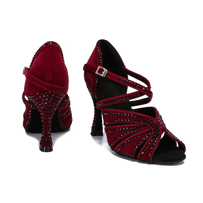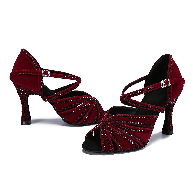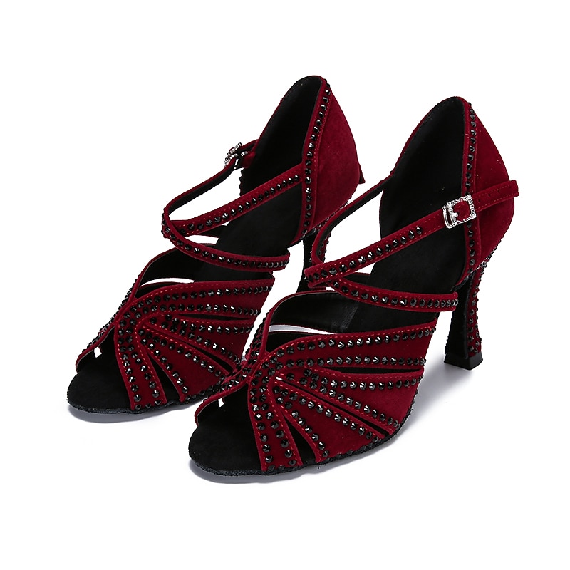 Highlights [Fabric] : Crafted from luxurious fleece, this pair of Latin dance shoes offers a plush and sophisticated touch, while the synthetic lining ensures durability and comfort throughout your performance. [Silhouette] : Featuring an open-toe design, these shoes allow for graceful movement and expression on the dance floor. The flared heel provides stability, combining elegance with functionality to enhance your dance experience. [Design Highlights] : The shoes are embellished with sparkling glitter, adding a touch of glamour to the rich dark red hue. The T-strap with an adjustable buckle not only ensures a secure fit but also enhances the shoes with a sleek and modern look, making a striking statement with every step. [Occasions] : Perfect for professional dance events, parties, and special occasions, these shoes are designed to impress. Whether at a competitive dance event or a festive gathering, they combine style and comfort, making them a must-have accessory for any dance enthusiast. [Size Range] : Available in a wide range of sizes from US5 to US11, these shoes cater to adult women of various foot sizes, ensuring that you can find the perfect fit for your dancing needs.