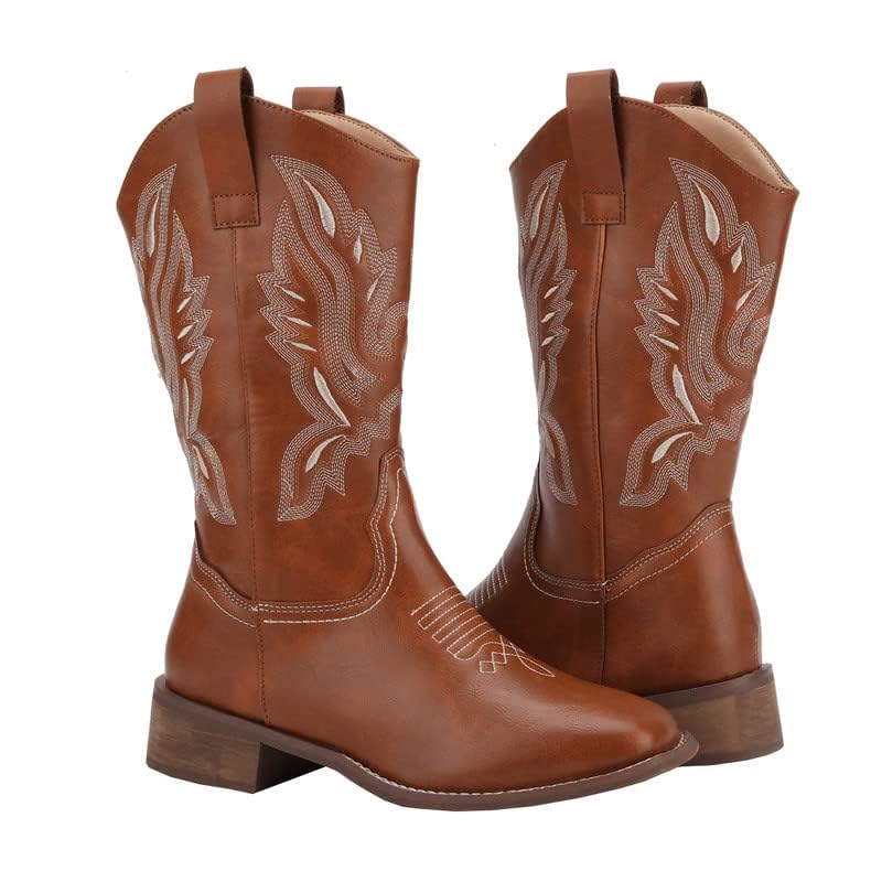 Women's Western Cowgirl Cowboy Boots Square Toe Embroidered Mid Calf Boots 5