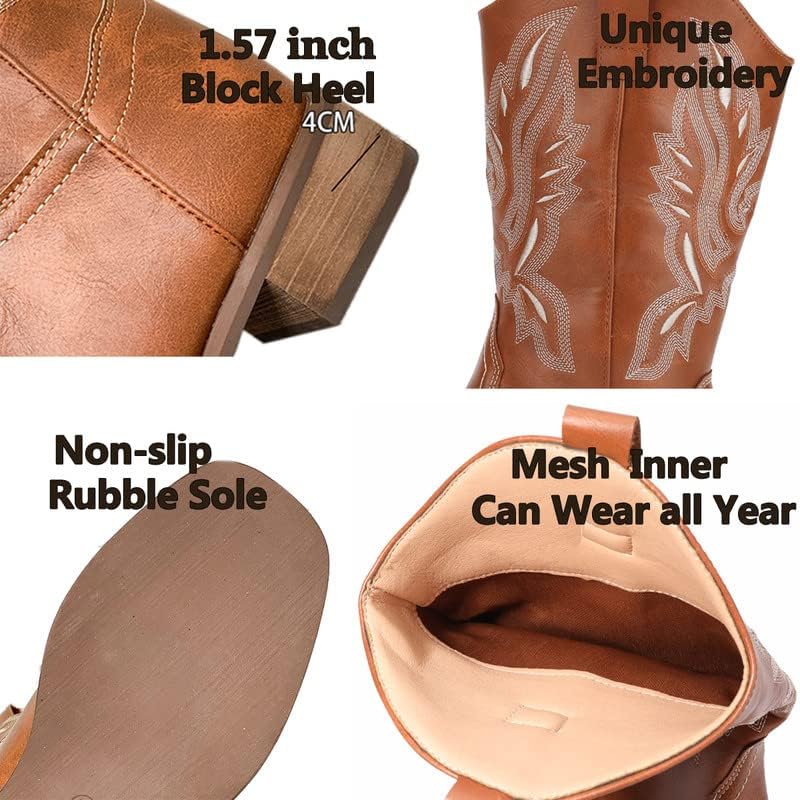 Women's Western Cowgirl Cowboy Boots Square Toe Embroidered Mid Calf Boots 4