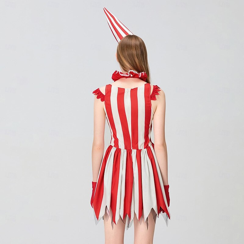 The vibrant red and white striped pattern captures attention effortlessly. The jagged-edge skirt lends a quirky flair, while the elaborate accessories like the pointed hat and ruffled neckpiece add a theatrical element, perfect for a standout look at any event.