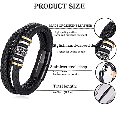 • 【Comfortable Material】To my son bracelet made of high quality genuine leather and stainless steel material, purely handmade tightly woven bracelet, soft and comfortable touch feeling; with a special stainless steel magtic clasp 8.46 inch (21.5 cm) (one size fits most men), Convenient to use, easy to put on or take off.