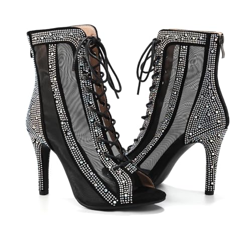 Womens Latin Dance Boots Peep Toe Mesh Lace Up Rhinestone Ballroom Dance Boots Practice Salsa Dance Heels DS118Z 5