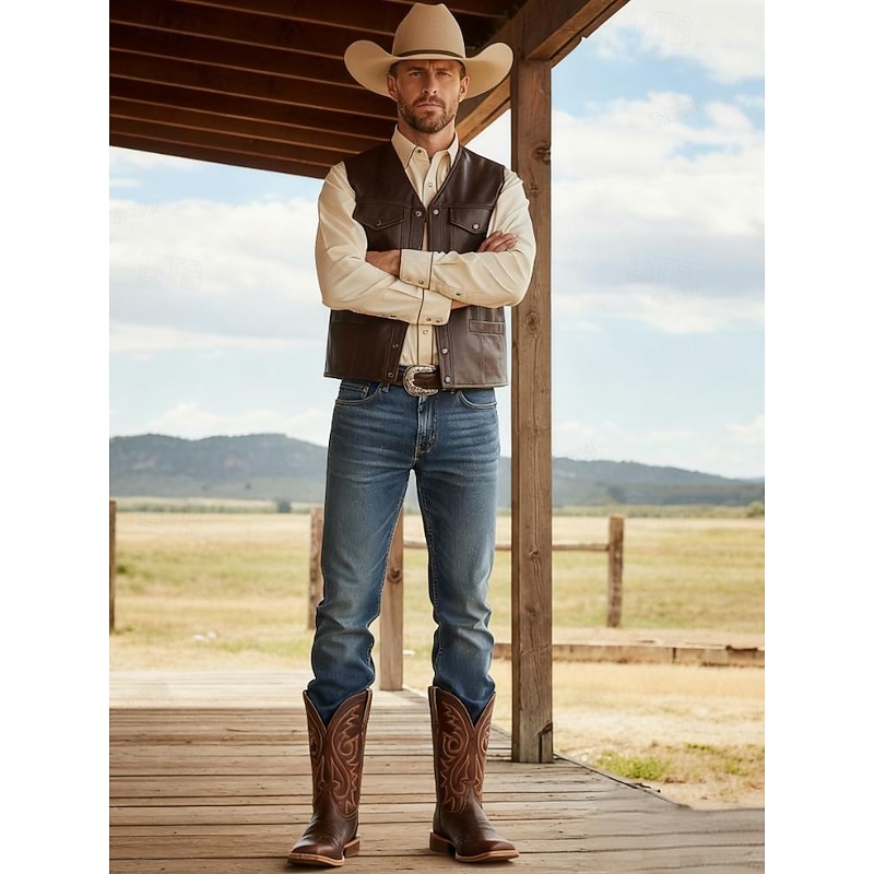 Men's Brown Western Cowboy Boots – Faux Leather with Intricate Embroidery, Classic Square Toe and Stacked Heel for Rodeo and Everyday Wear 1