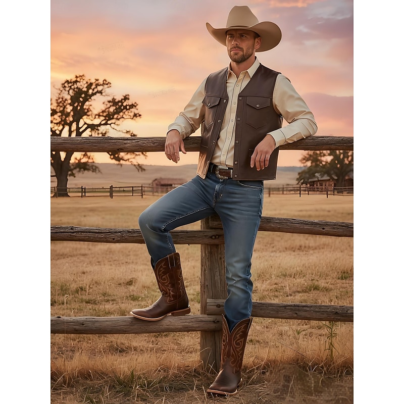 Men's Brown Western Cowboy Boots – Faux Leather with Intricate Embroidery, Classic Square Toe and Stacked Heel for Rodeo and Everyday Wear 5