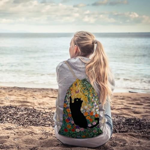 Black Cat Flower Garden Butterflies Drawstring Backpack Canvas String Bag Lightweight Sports Gym Bag for Men Women 5