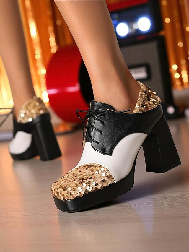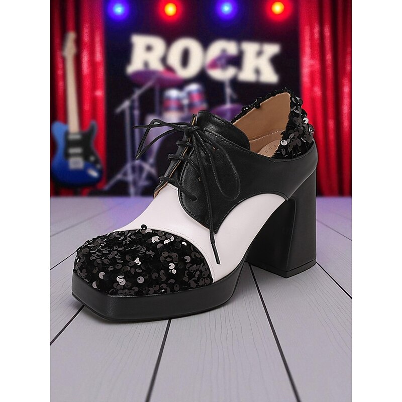Women's Sequin Oxford Chunky Heel Shoes - 1980s Retro Lace-Up Platform Block Heel Party Pumps for Evening, Cocktail and Dance Wear 1