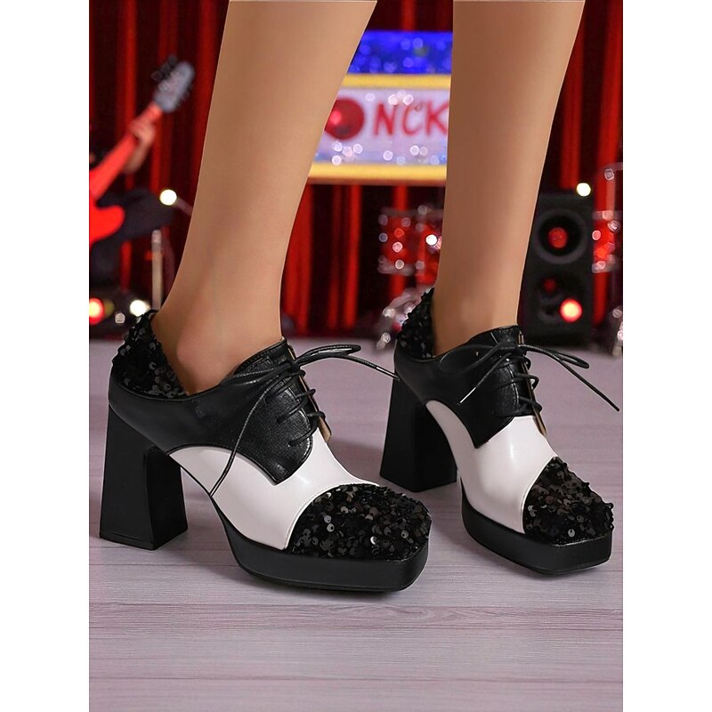 HOT ! Women's Sequin Oxford Chunky Heel Shoes - 1980s Retro Lace-Up Platform Block Heel Party Pumps for Evening, Cocktail and Dance Wear