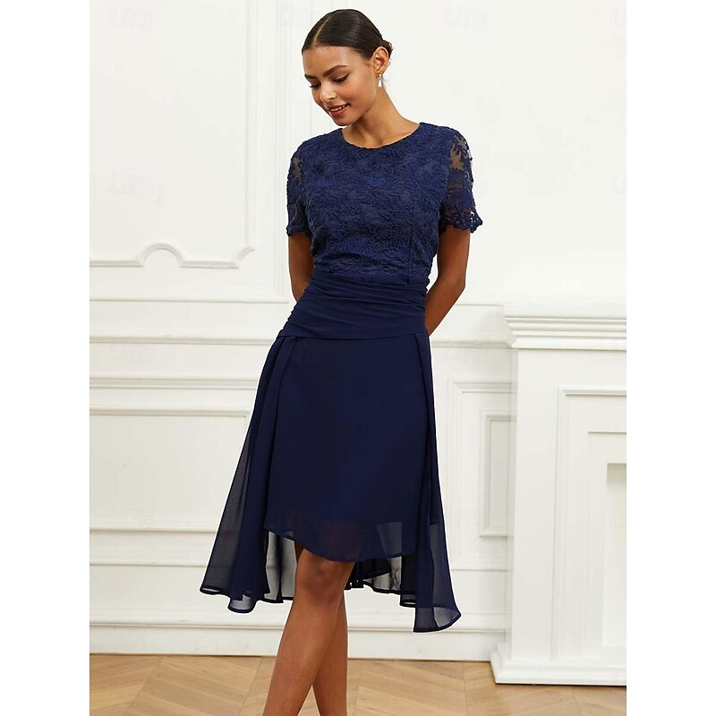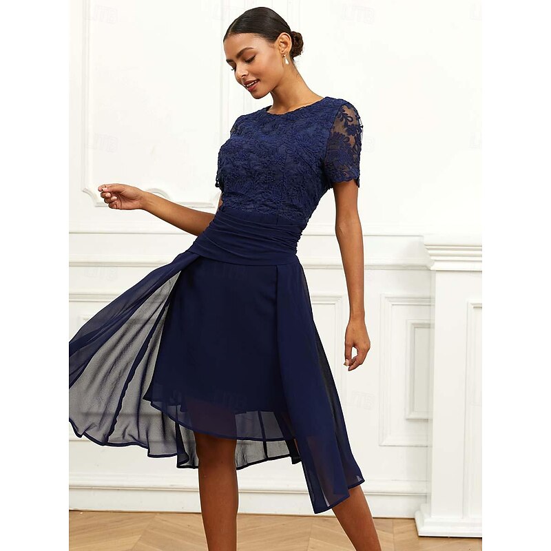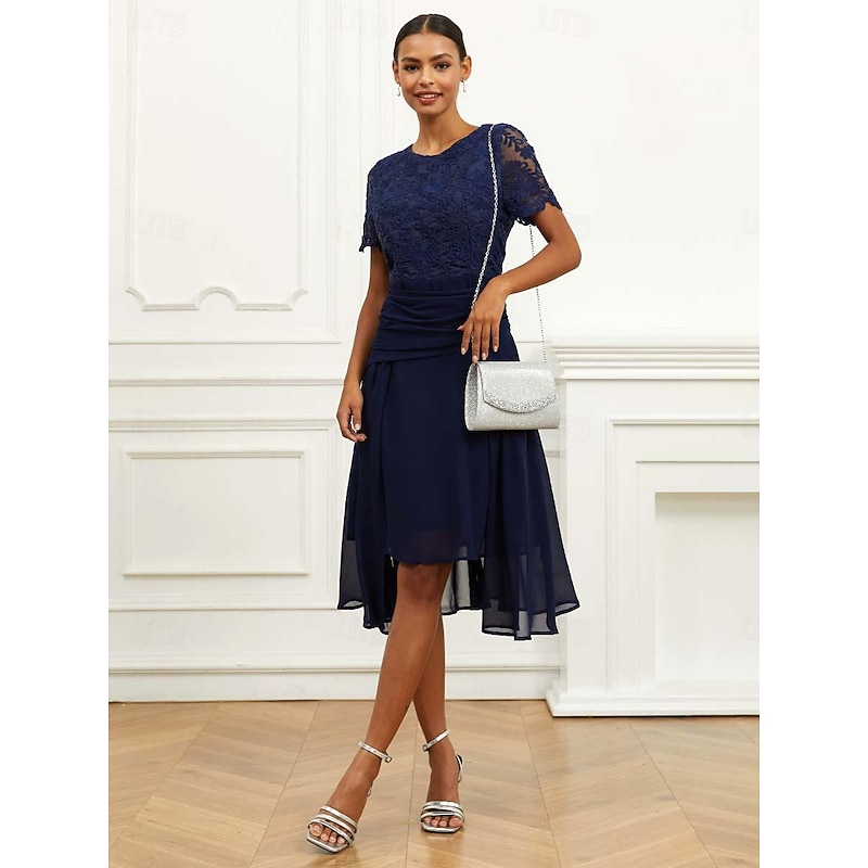 HOT ! Women's Wedding Guest Cocktail Dress Chiffon Lace Ruched Crew Neck Short Sleeve Midi Dress Party Elegant Formal Dark Blue Summer