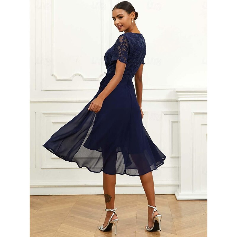 More information about Women's Wedding Guest Cocktail Dress Chiffon Lace Ruched Crew Neck Short Sleeve Midi Dress Party Elegant Formal Dark Blue Summer