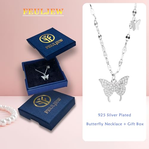 Material: Sterling SilverMetal type: Sterling SilverClasp type: Toggle ClaspGem type: Cubic Zirconia925 Silver Necklace - Women's Butterfly Necklace is made of 925 silver material, durable and long-lasting, free of nickel and lead, low allergenic, and not prone to allergic reactions.exclusive Butterfly Shape - The butterfly pendant of this necklace is embedded with cubic zirconia and features a small butterfly on the side, which is very delicate and adds more feminine charm, making it popular among women.Adjustable Length - The exquisite dainty butterfly necklace features an adjustable 18+2-inch extension chain design, allowing you to freely adjust the length of the chain according to your personal preferences and needs to ensure a comfortable fit around your neck.Exquisite Gift Box - This butterfly choker necklace features a simple yet classic design, suitable for wearing in various occasions; The accompanying blue exquisite accessory box can be given as a gift to family, friends, mothers, grandmothers, birthdays, holidays, and other occasions at any time.Multiple Combinations - FEULJEW sterling silver butterfly necklace can be paired with different styles of clothing and accessories, suitable for both casual and formal occasions. It can be used as daily decoration or paired with evening or formal dresses to add highlights to the overall look. Perfect for everyday use. first-class materials and excellent craftsmanship ensure long-lasting durability.