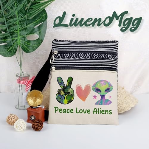 HOT ! Peace Love Aliens Messenger Bag Small Ethnic Pattern Printed Adjustable Strap Crossbody Zipper Bag Phone Bag Wallet Cute Shoulder Handbag for Alien Lovers Women