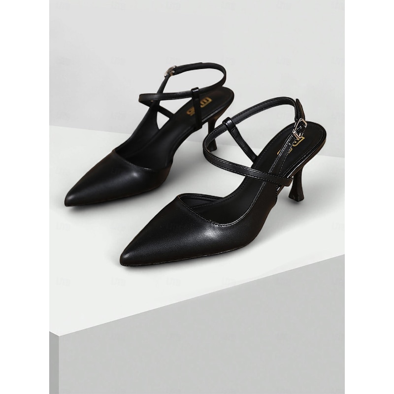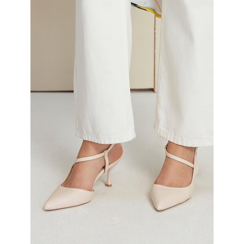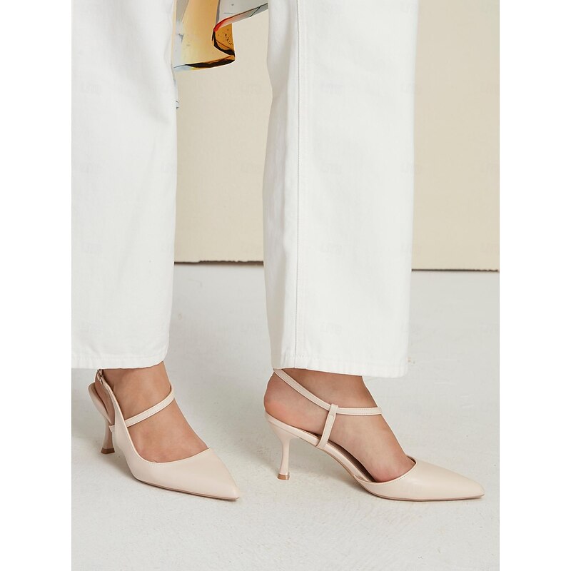 Highlights [Fabric] : Crafted from high-quality faux leather, these women's elegant slingback pumps offer a smooth and refined texture, ensuring both durability and a sophisticated appearance. [Silhouette] : Featuring a modern pointed toe and a chic, sleek design, these shoes boast a streamlined silhouette that complements a variety of stylish ensembles. [Design Highlights] : The shoes are adorned with a delicate buckle embellishment on the ankle strap, providing additional support and a touch of elegance. The kitten heel offers not only a graceful lift but also ensures comfort for extended wear, perfect for transitioning from day to night. [Occasions] : Ideal for various occasions, these versatile pumps are perfect for vacation days, weddings, parties, and professional work settings. Designed to complement a diverse wardrobe, their timeless nude hue adds a touch of elegance to any outfit. [Size Range] : Available in a comprehensive range of sizes, including US5/EU35/UK3 through US11/EU41/UK9, these shoes ensure a perfect fit for a wide range of wearers.