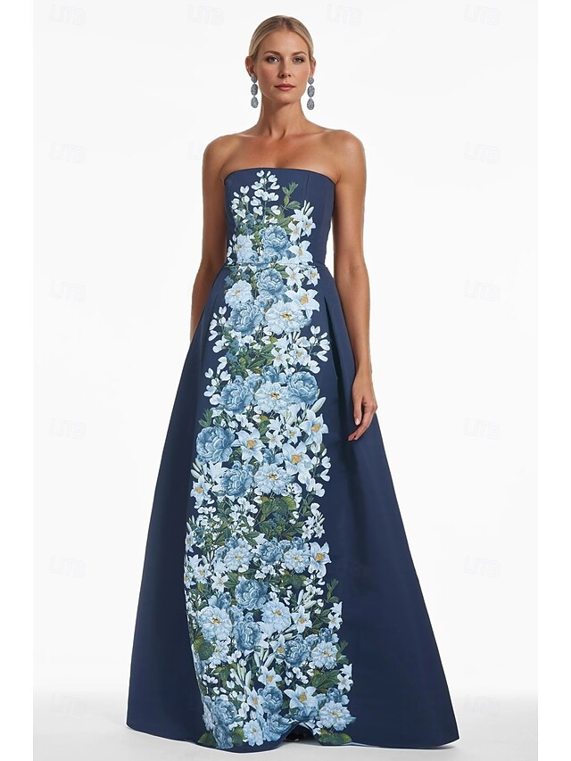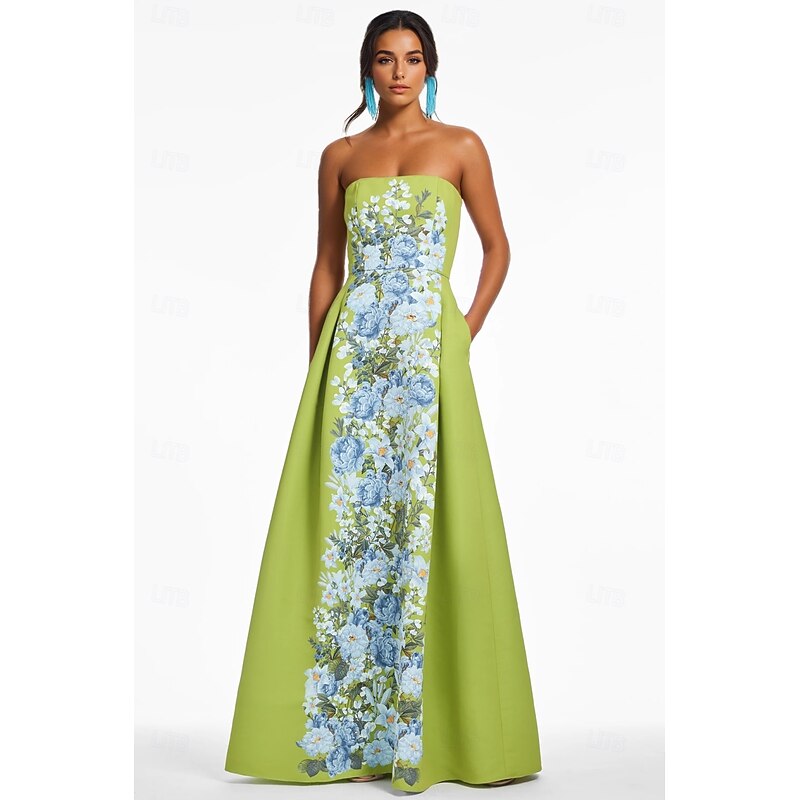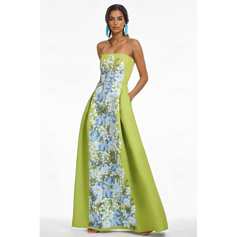 Floral A-Line Evening Gown Elegant Dress Formal Wedding Floor Length Sleeveless Strapless Satin Wedding Guest Dress 1