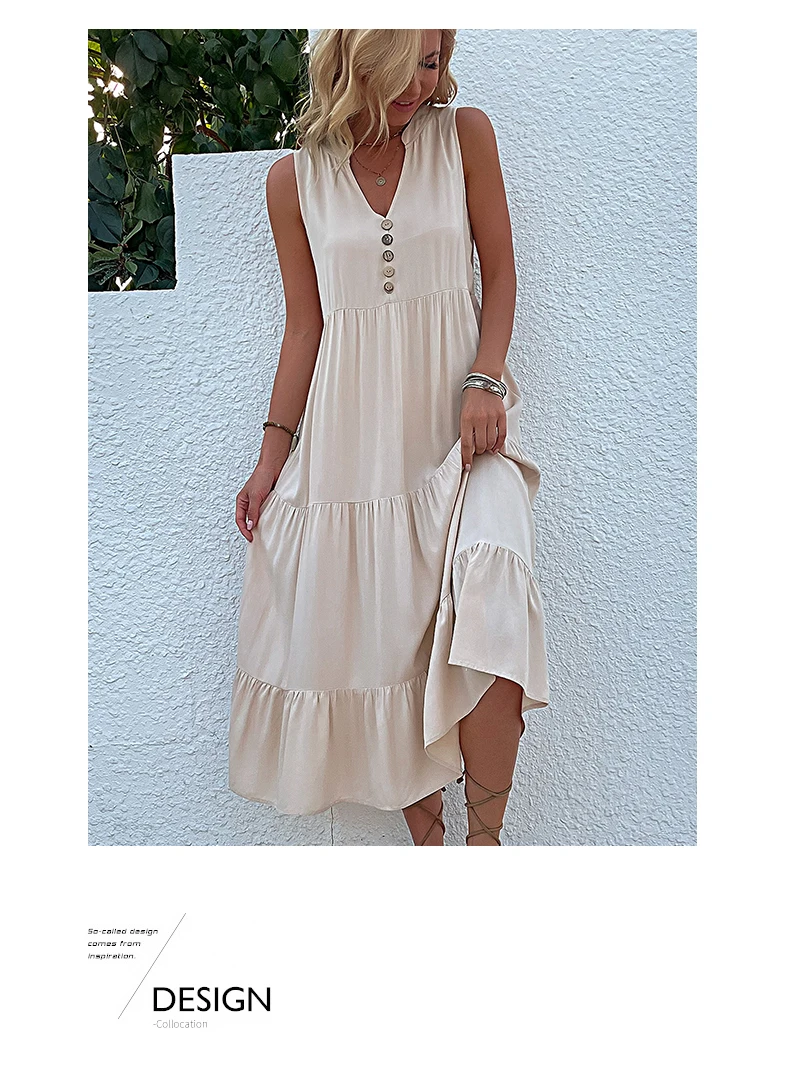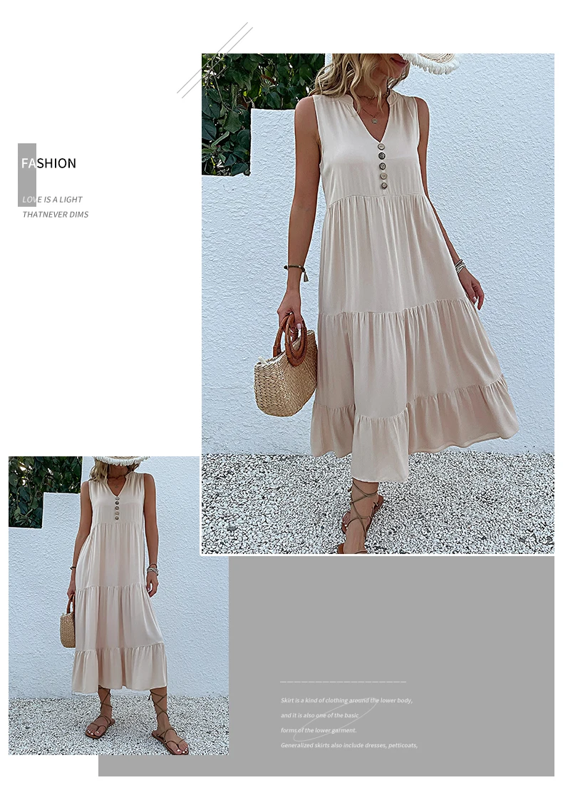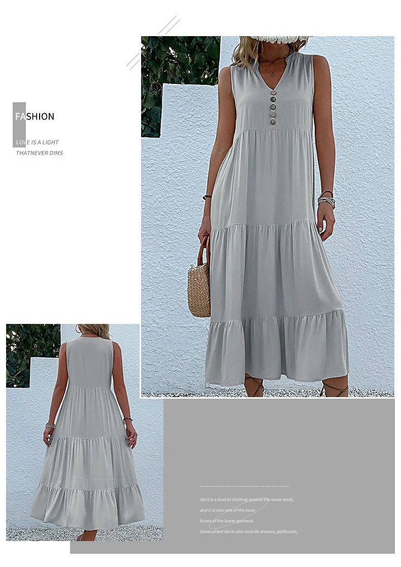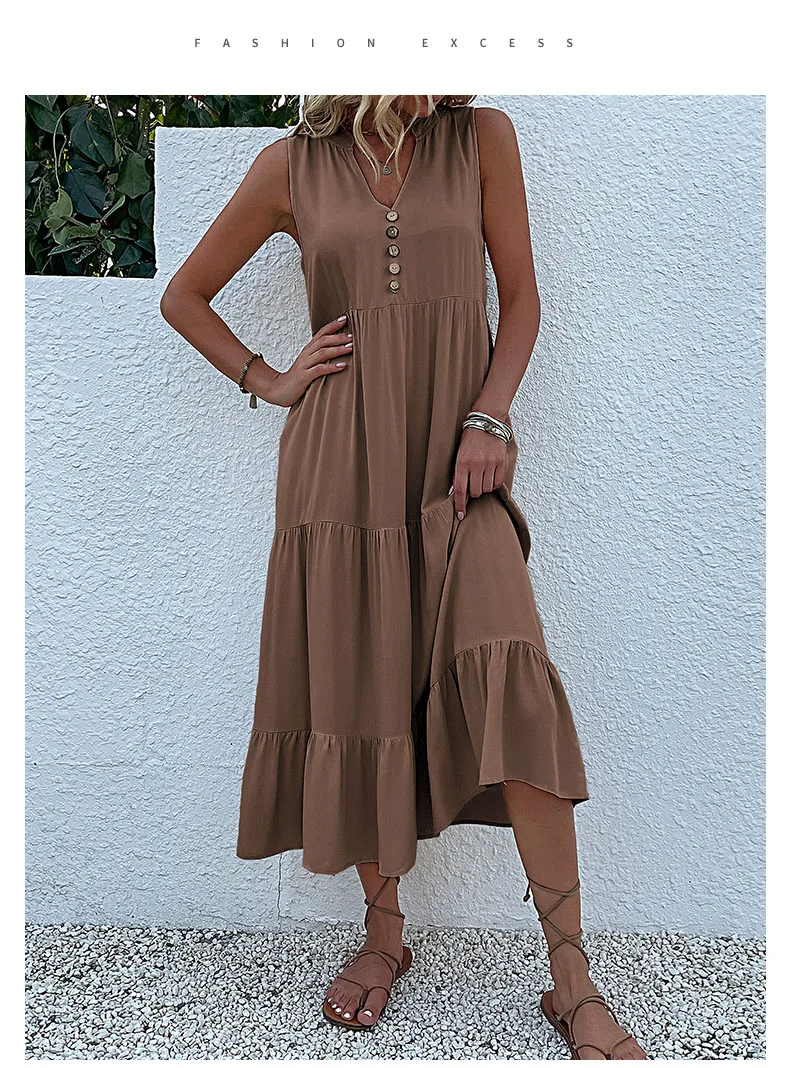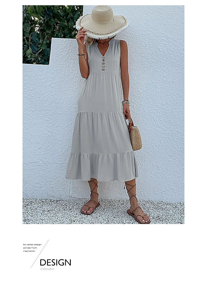 Perfect for Casual Summer Midi Dress Women Sleeveless Tank V Neck Buttons Ruffle Loose Dresses Beach Soild Sundress Fashion