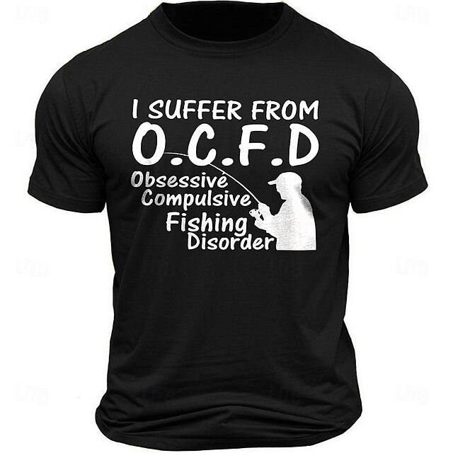 Highlights [Fabric] : Crafted from 100% high-quality cotton, this T-shirt offers a soft, breathable, and comfortable feel perfect for everyday wear. Its micro-elastic nature ensures a snug yet relaxed fit, making it a versatile choice for various activities. [Fit] : Designed with a classic crew neck and short sleeves, this tee provides a regular fit that balances comfort and style. The micro-elastic material adapts to your body's movements, making it ideal for both indoor and outdoor settings. [Design Highlights] : The playful graphic on this T-shirt features the humorous slogan "I Suffer from O.C.F.D Obsessive Compulsive Fishing Disorder" alongside a fishing silhouette. The bold white print stands out against the dark fabric, adding a unique touch of humor and personality. Available in black and army green, it caters to different style preferences. [Occasions] : Perfect for outdoor sports, holidays, casual outings, or simply as a comfortable option for a day out. Its versatile design makes it an excellent choice for fishing enthusiasts or those looking for a fun gift idea. [Size Range] : Available in sizes S, M, L, XL, and XXL, this tee is designed to accommodate a variety of body types and preferences, ensuring the perfect fit for all adult men.