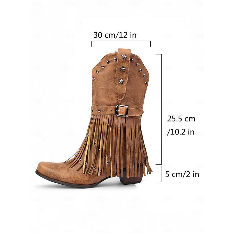 HOT ! Women's Western Fringe Cowboy Boots - Tan Faux Suede Star Studded Mid-Calf Boots with Buckle for Rodeo, Country Concerts or Fall Festivals